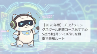 プログラミングスクール 【2026年版】プログラミングスクール副業コースおすすめ5社比較|月5〜10万円を目指す最短ルート ナビ助副業でプログラミングを始めるなら、正直「スキル」よりも「最初の案件をどう取るか」が一番の壁なんだよね。ねころぼが副業に最適なスクールを厳選したから、参考にしてほしいな!結論:副業で月5〜10万円を目指すなら、案件紹介つきのスクールを選... 2026.04.15 プログラミングスクール